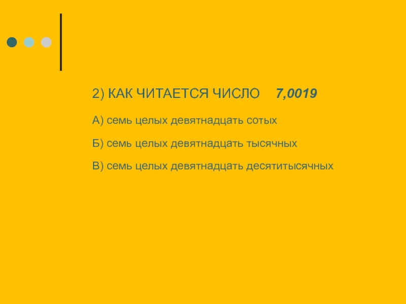 2) КАК ЧИТАЕТСЯ ЧИСЛО  7,0019  А) семь целых девятнадцать сотых Б) семь целых девятнадцать тысячных