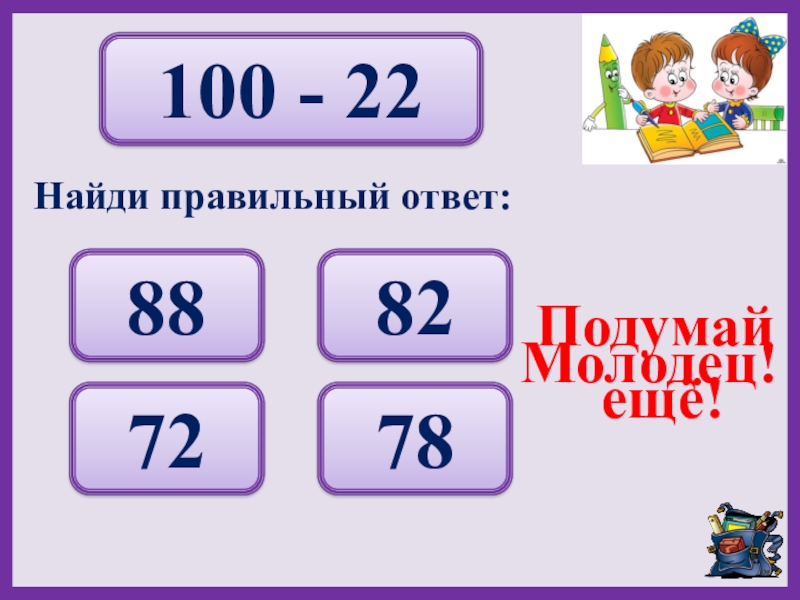 100 - 2288 82 72 78 Подумай ещё!Молодец!Найди правильный ответ: