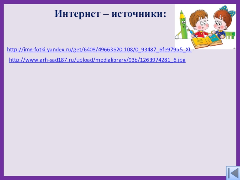 Интернет – источники:http://img-fotki.yandex.ru/get/6408/49663620.108/0_93487_6fe979b5_XL -http://www.arh-sad187.ru/upload/medialibrary/93b/1263974281_6.jpg