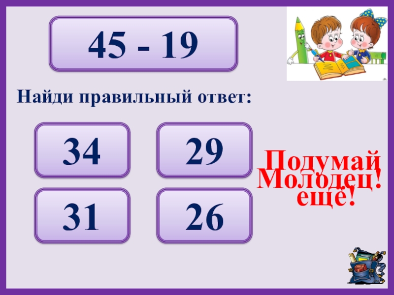 45 - 1934 29 31 26 Подумай ещё!Молодец!Найди правильный ответ: