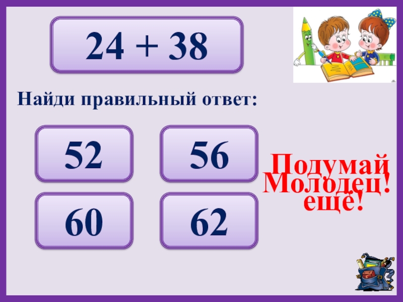 24 + 3852 56 60 62 Подумай ещё!Молодец!Найди правильный ответ: