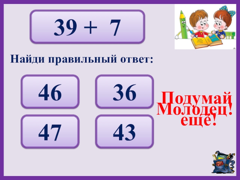 39 + 746 36 47 43 Подумай ещё!Молодец!Найди правильный ответ: