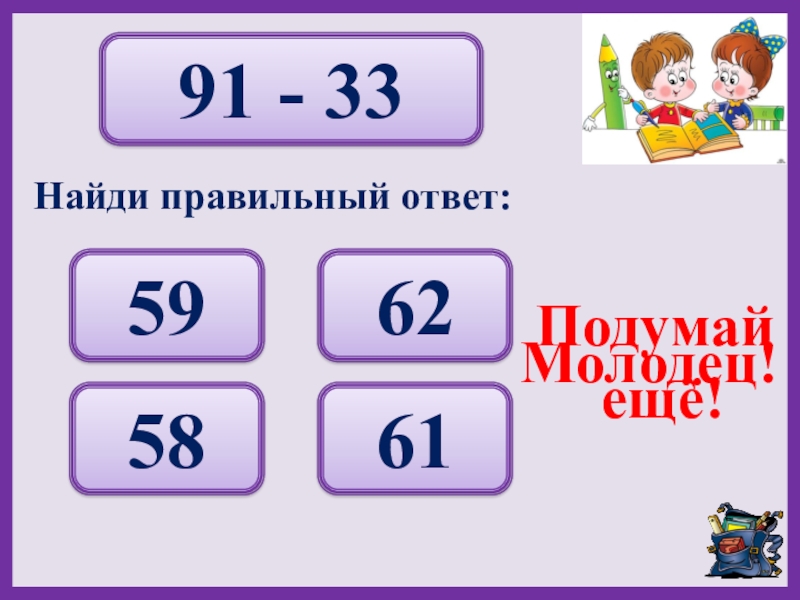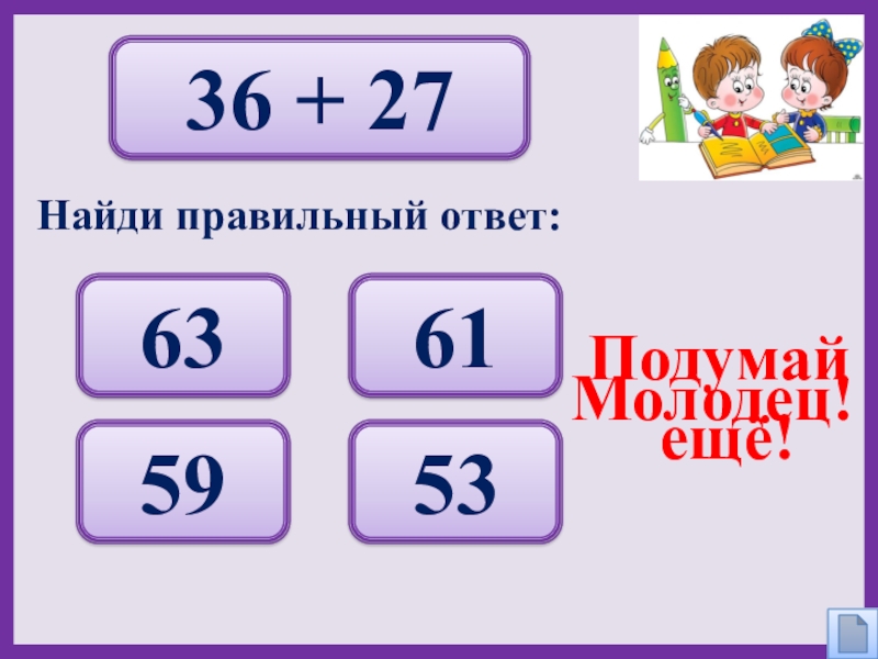 36 + 27 63 61 59 53 Подумай ещё!Молодец!Найди правильный ответ: