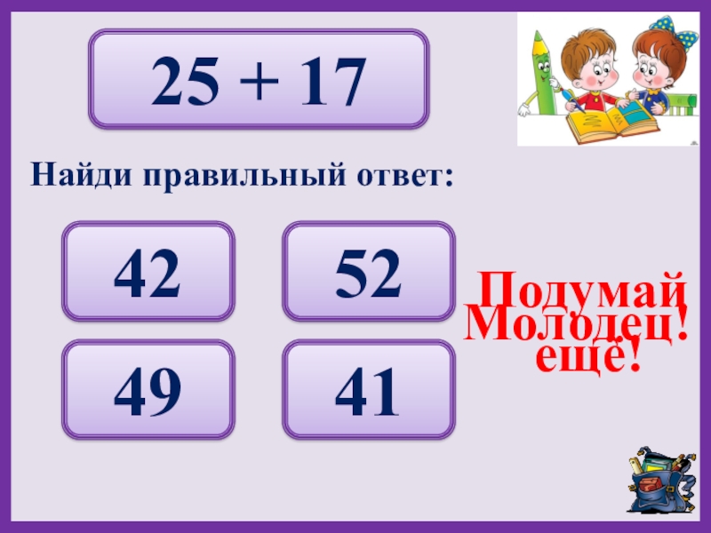 25 + 1742 52 49 41 Подумай ещё!Молодец!Найди правильный ответ: