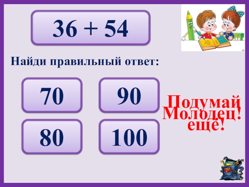 36 + 5470 90 80 100 Подумай ещё!Молодец!Найди правильный ответ: