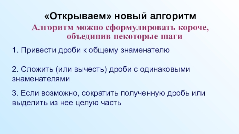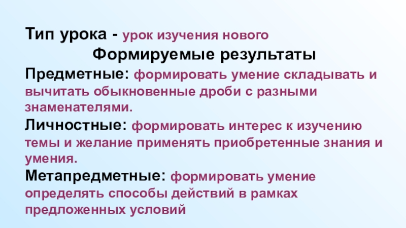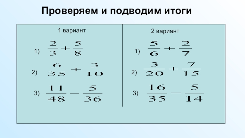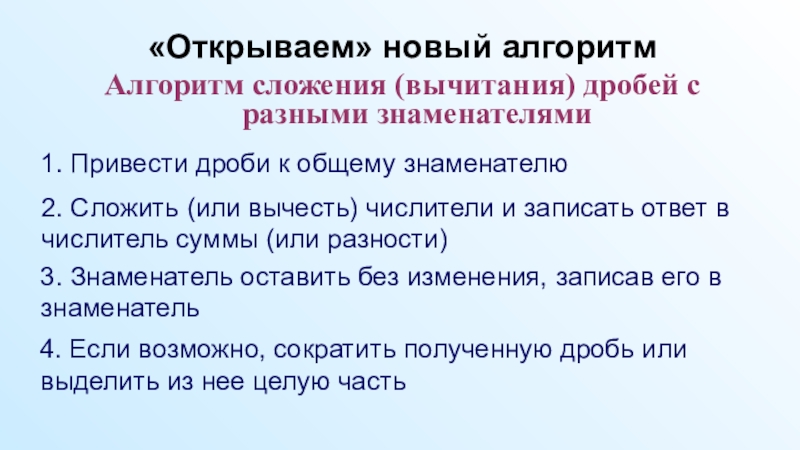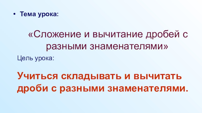 Презентация к уроку по учебному предмету «Математика» в 6-м классе на тему «Сложение и вычитание дробей с разными знаменателями»