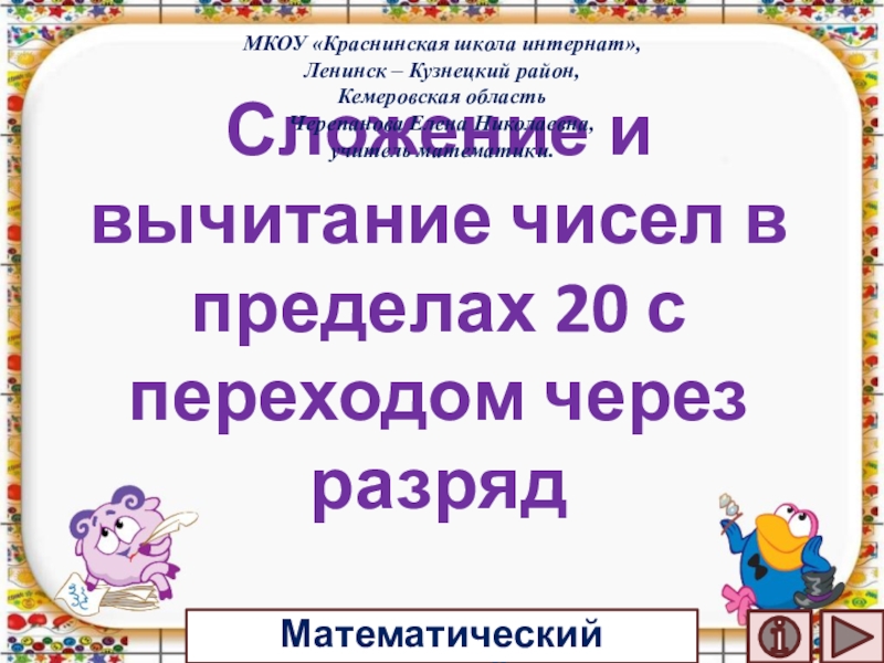 Презентация, доклад по математике Сложение и вычитание чисел в пределах 20 с переходом через разряд. Интерактивный тренажёр