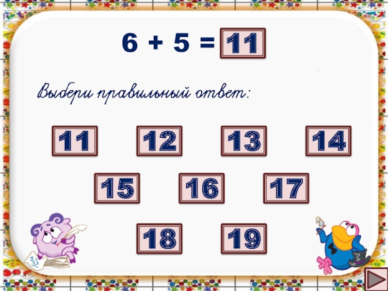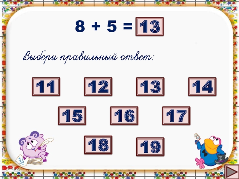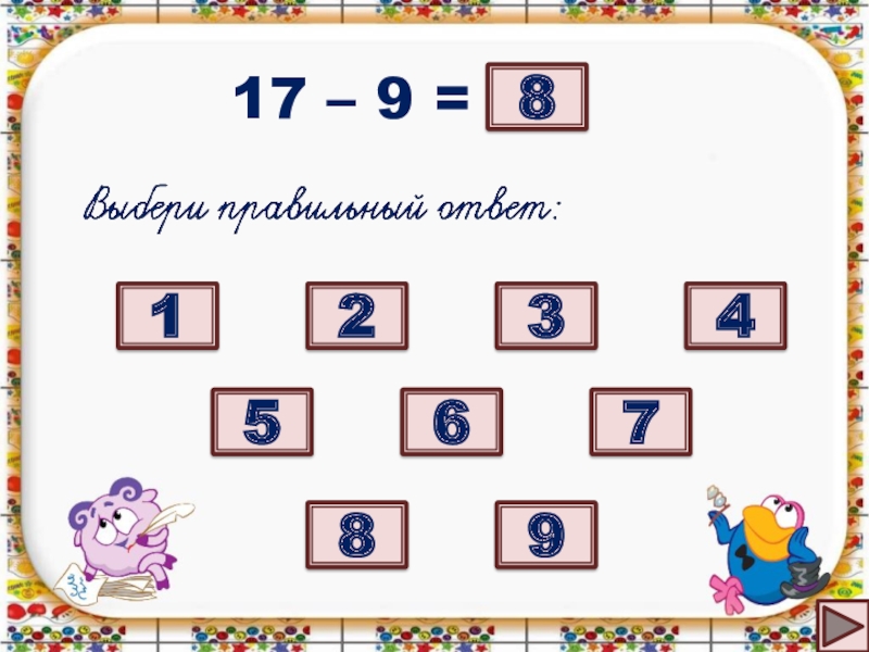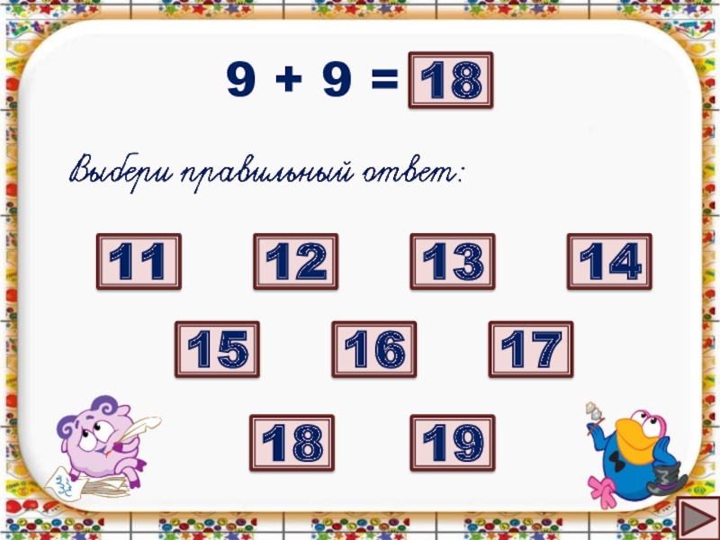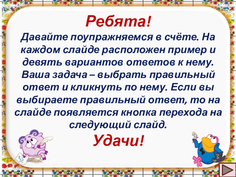 Ребята!Давайте поупражняемся в счёте. На каждом слайде расположен пример и девять вариантов ответов к нему. Ваша задача – выбрать правильный ответ и кликнуть по нему. Если вы выбираете правильный ответ, то на слайде появляется кнопка перехода