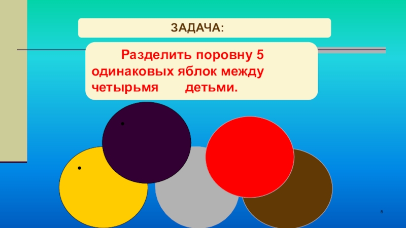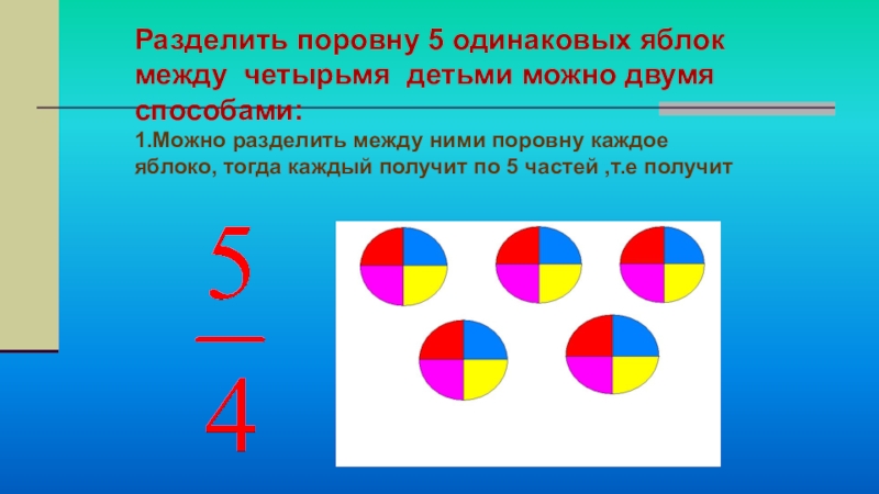 Слайд 9Разделить поровну 5 одинаковых яблок между четырьмя детьми можно двумя способами: