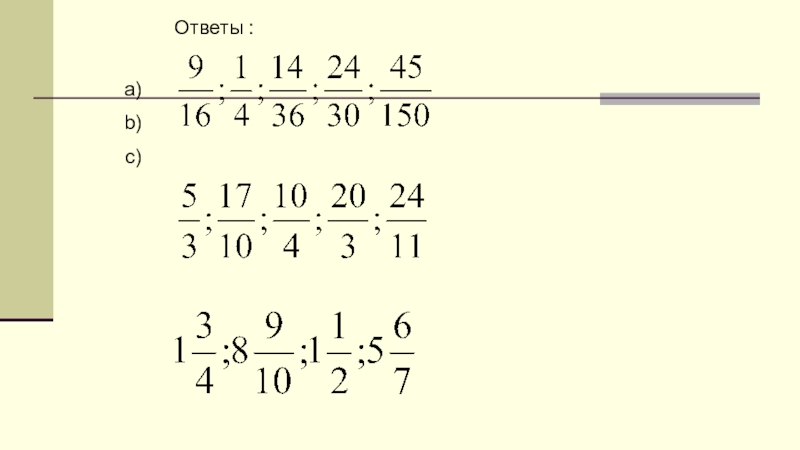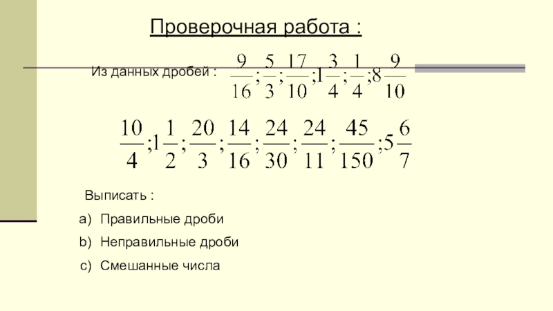 Проверочная работа :Из данных дробей :Выписать :Правильные дробиНеправильные дробиСмешанные числа