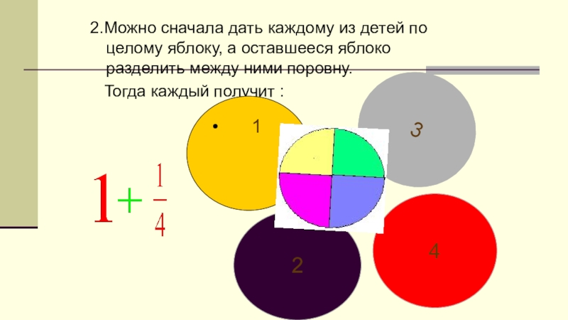 2.Можно сначала дать каждому из детей по целому яблоку, а оставшееся яблоко разделить между ними поровну.
