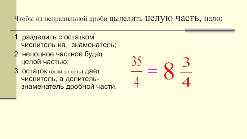 Чтобы из неправильной дроби выделить целую часть, надо:1. разделить с остатком числитель на  знаменатель;2. неполное частное