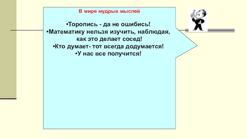 В мире мудрых мыслейТоропись - да не ошибись!Математику нельзя изучить, наблюдая, как это делает сосед!Кто думает-