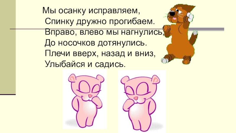 Мы осанку исправляем, Спинку дружно прогибаем. Вправо, влево мы нагнулись, До носочков дотянулись. Плечи вверх, назад и