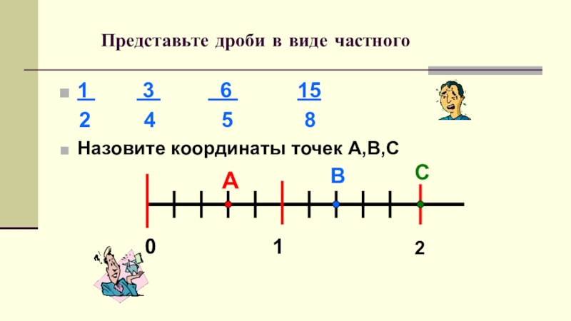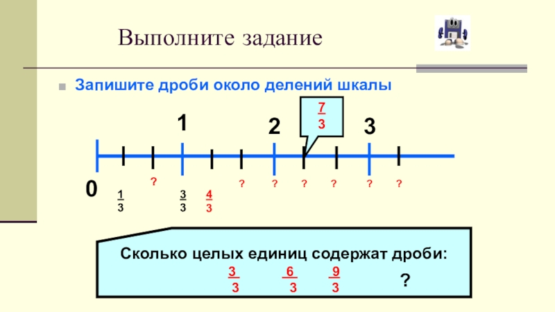 Выполните заданиеЗапишите дроби около делений шкалы01231?343??????Сколько целых единиц содержат дроби:3       6