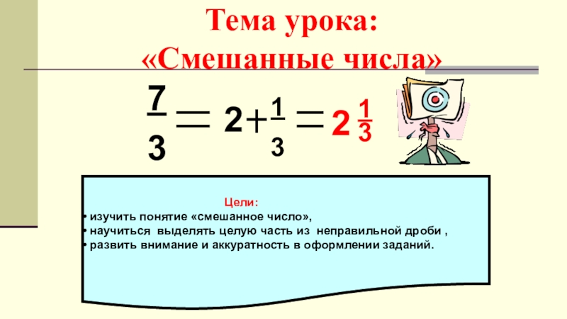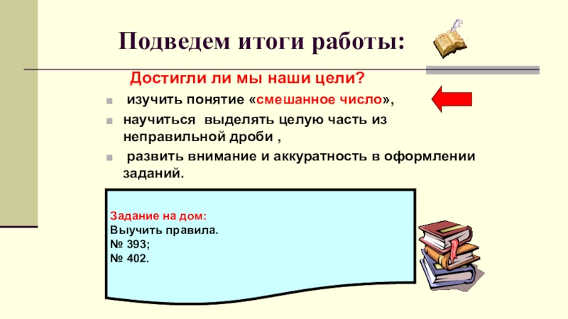 Подведем итоги работы:   Достигли ли мы наши цели? изучить понятие «смешанное число»,научиться выделять целую часть