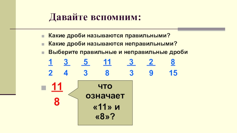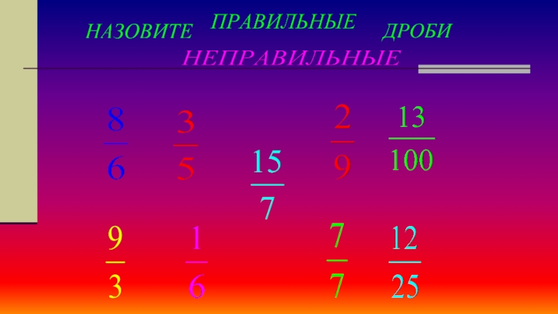 Давайте вспомним:Какие дроби называются правильными?Какие дроби называются неправильными?Выберите правильные и неправильные дроби  1   3