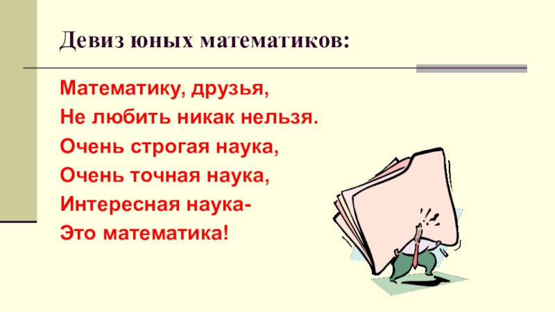 Девиз юных математиков:Математику, друзья,Не любить никак нельзя.Очень строгая наука,Очень точная наука, Интересная наука- Это математика!