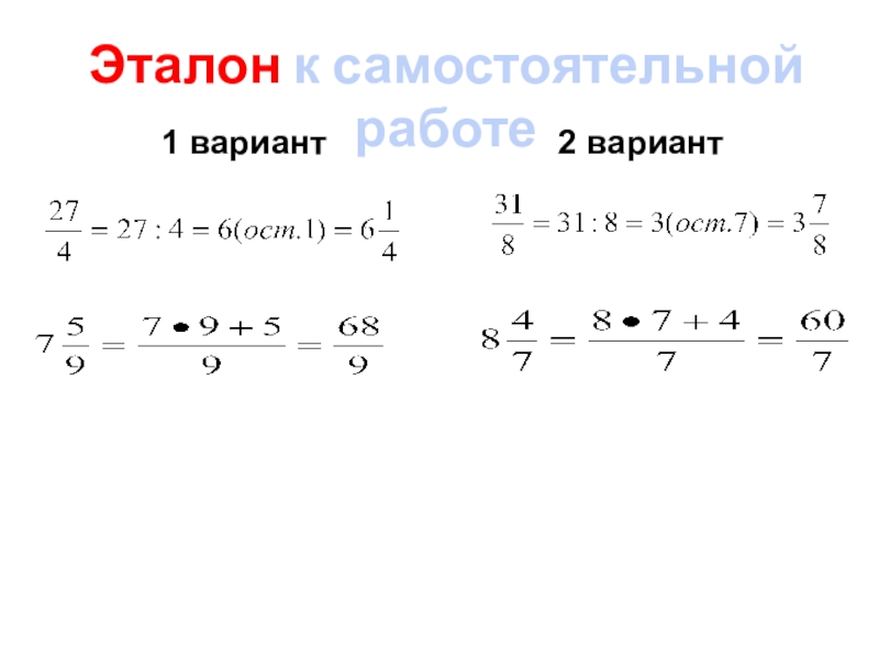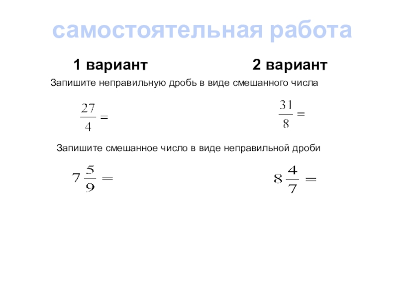 самостоятельная работа1 вариант2 вариантЗапишите неправильную дробь в виде смешанного числаЗапишите смешанное число в виде неправильной дроби