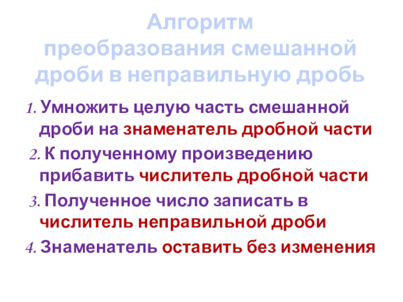 Алгоритм  преобразования смешанной дроби в неправильную дробь1. Умножить целую часть смешанной дроби на знаменатель дробной части
