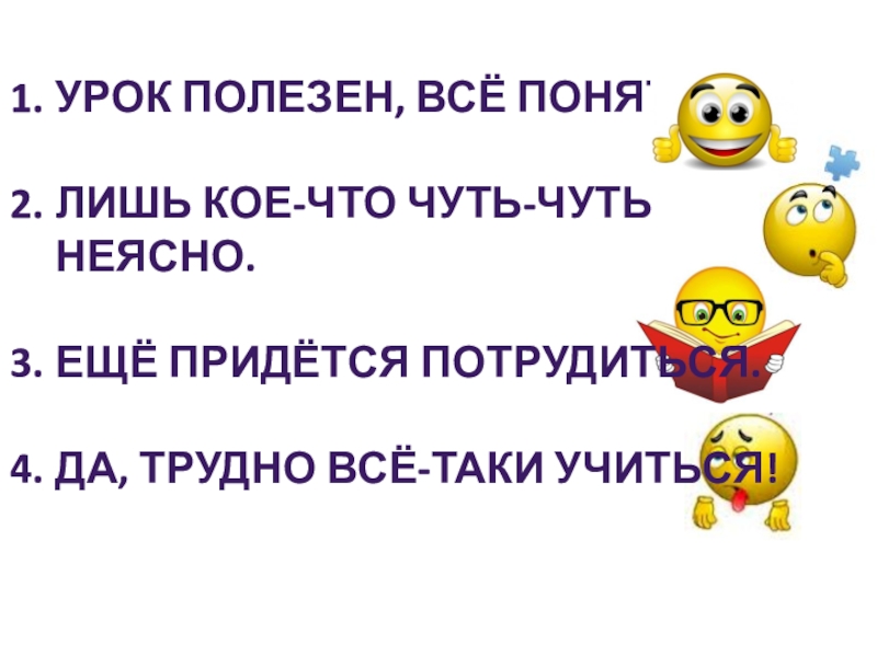 УРОК ПОЛЕЗЕН, ВСЁ ПОНЯТНО.ЛИШЬ КОЕ-ЧТО ЧУТЬ-ЧУТЬ НЕЯСНО.ЕЩЁ ПРИДЁТСЯ ПОТРУДИТЬСЯ.ДА, ТРУДНО ВСЁ-ТАКИ УЧИТЬСЯ!