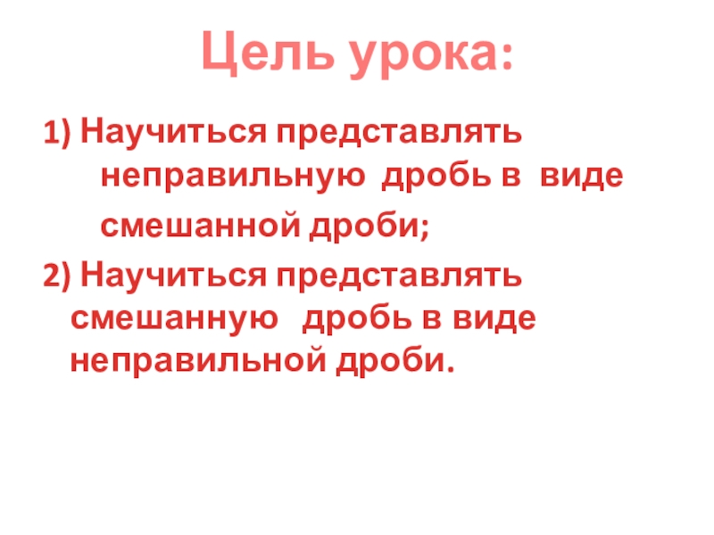 Цель урока:1) Научиться представлять неправильную дробь в виде    смешанной дроби; 2) Научиться представлять смешанную