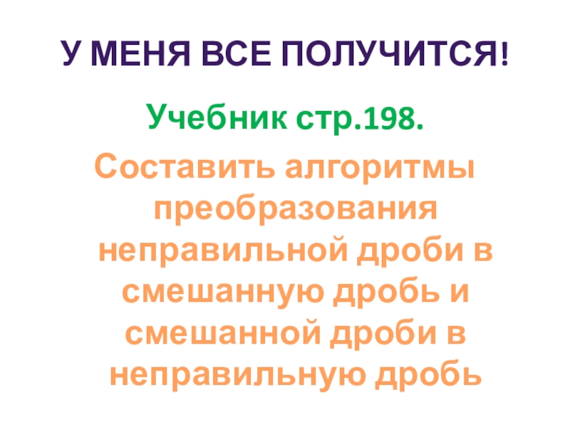 У МЕНЯ ВСЕ ПОЛУЧИТСЯ!Учебник стр.198.Составить алгоритмы преобразования неправильной дроби в смешанную дробь и смешанной дроби в неправильную