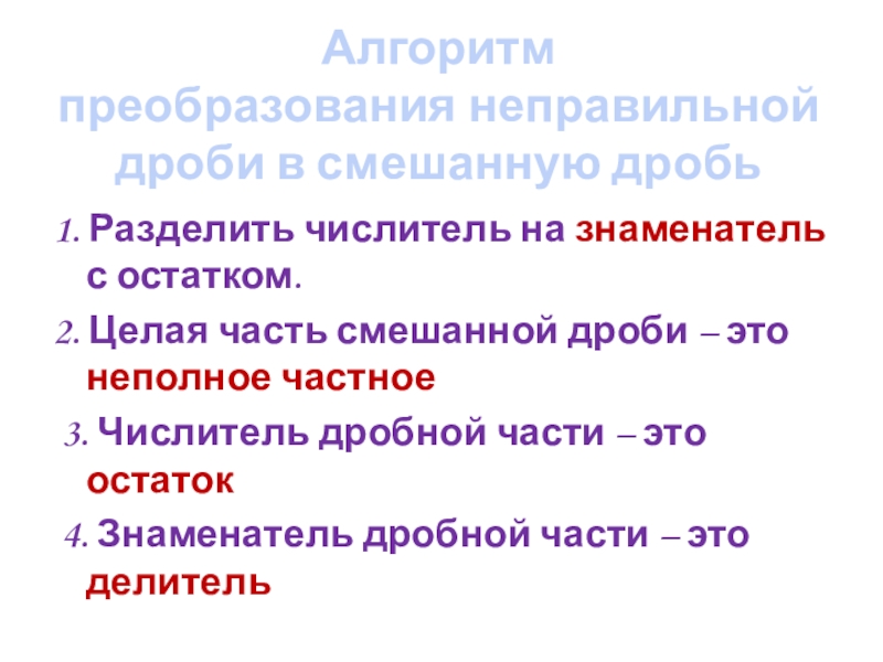 Алгоритм  преобразования неправильной дроби в смешанную дробь1. Разделить числитель на знаменатель с остатком.2. Целая часть смешанной