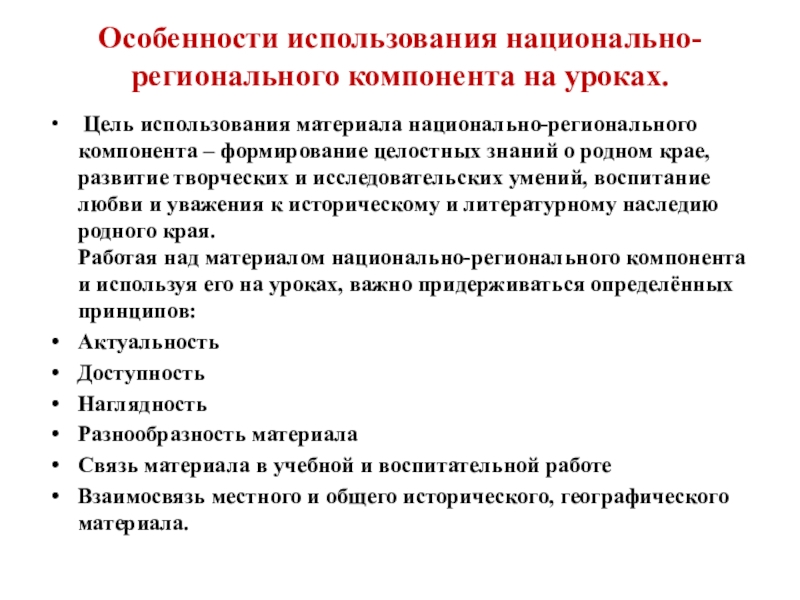 Работая над материалом национально-регионального компонента и используя его на уроках, важно придерживаться определённых принципов: