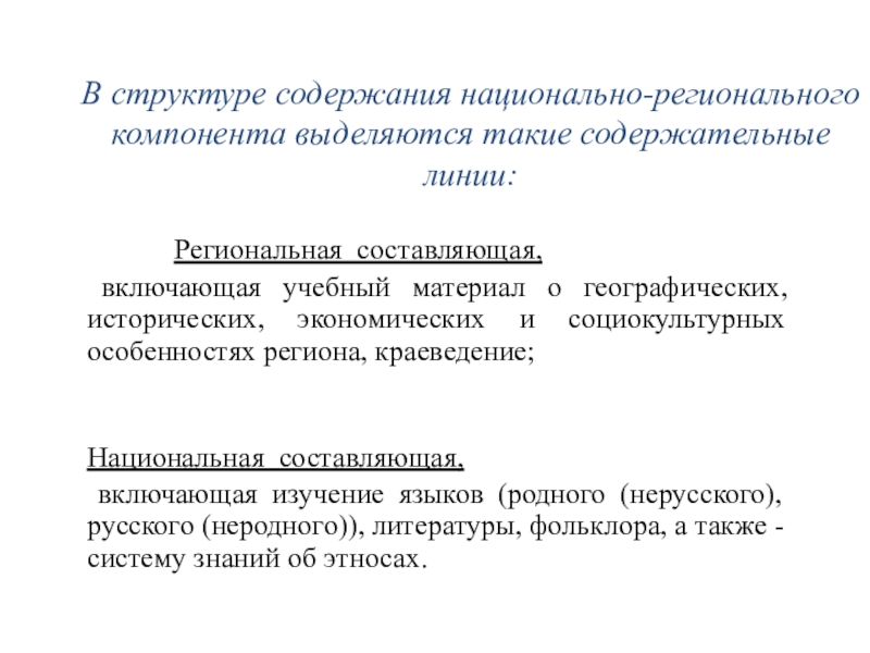Слайд 12В структуре содержания национально-регионального компонента выделяются такие содержательные линии: