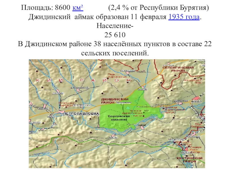 Слайд 17Площадь: 8600 км² (2,4 % от Республики Бурятия)