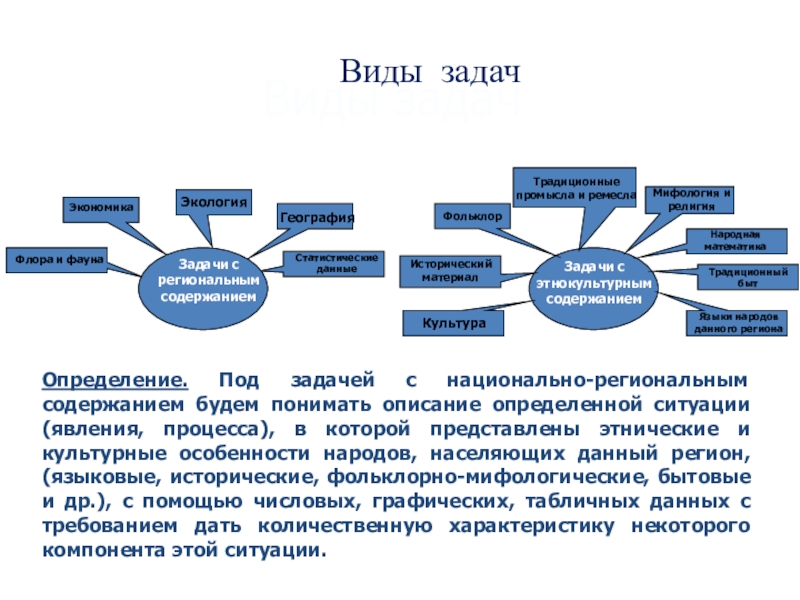 Определение. Под задачей с национально-региональным содержанием будем понимать описание определенной ситуации (явления, процесса), в которой представлены этнические и культурные особенности народов, населяющих данный регион, (языковые, исторические, фольклорно-мифологические, бытовые и др.), с помощью числовых, графических, табличных данных с требованием дать количественную характеристику некоторого компонента этой ситуации.