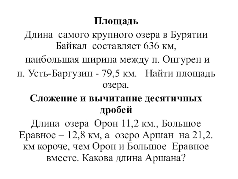 п. Усть-Баргузин - 79,5 км. Найти площадь озера.