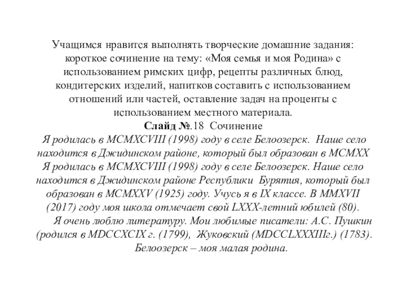 Я родилась в MCMXCVIII (1998) году в селе Белоозерск. Наше село находится в Джидинском районе, который был образован в MCMXX Я родилась в MCMXCVIII (1998) году в селе Белоозерск. Наше село находится в Джидинском районе Республики Бурятия, который был образован в MCMXXV (1925) году. Учусь я в IX классе. В MMXVII (2017) году моя школа отмечает свой LXXX-летний юбилей (80).