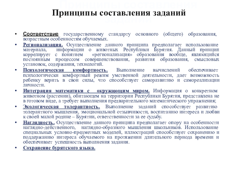 Регионализация. Осуществление данного принципа предполагает использование материала, информации о животных Республики Бурятия. Данный принцип коррелирует с понятием «регионализация» образования вообще, являющийся постоянным процессом совершенствования, развития образования, смысловых установок, содержания, технологий.