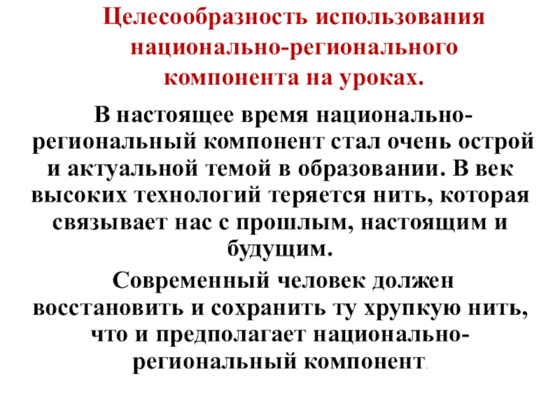 Современный человек должен восстановить и сохранить ту хрупкую нить, что и предполагает национально-региональный компонент.