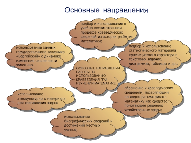 Слайд 11ОСНОВНЫЕ НАПРАВЛЕНИЯ РАБОТЫ ПО ИСПОЛЬЗОВАНИЮ КРАЕВЕДЕНИЯ ПРИ ИЗУЧЕНИИ МАТЕМАТИКЕ:
