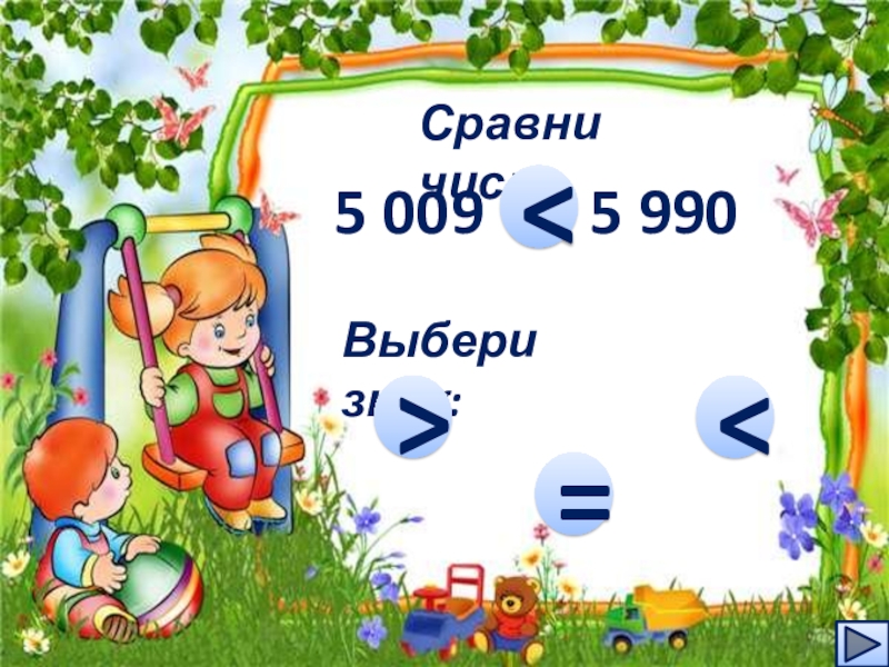 Сравни числа5 009    5 990…Выбери знак:=