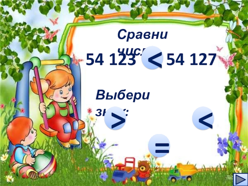 Сравни числа54 123    54 127…Выбери знак: