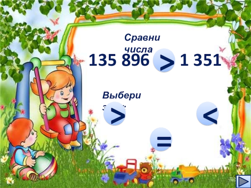Сравни числа135 896    1 351…Выбери знак:>