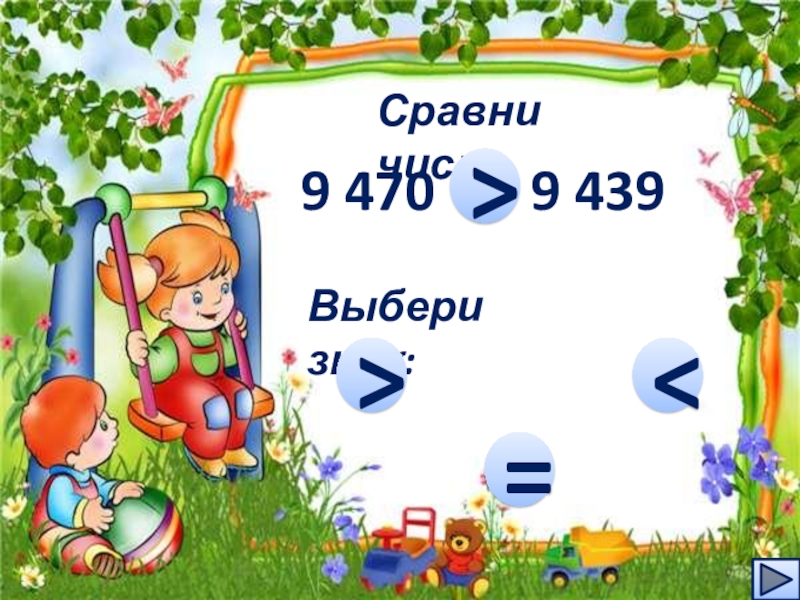 Сравни числа9 470    9 439…Выбери знак:>=
