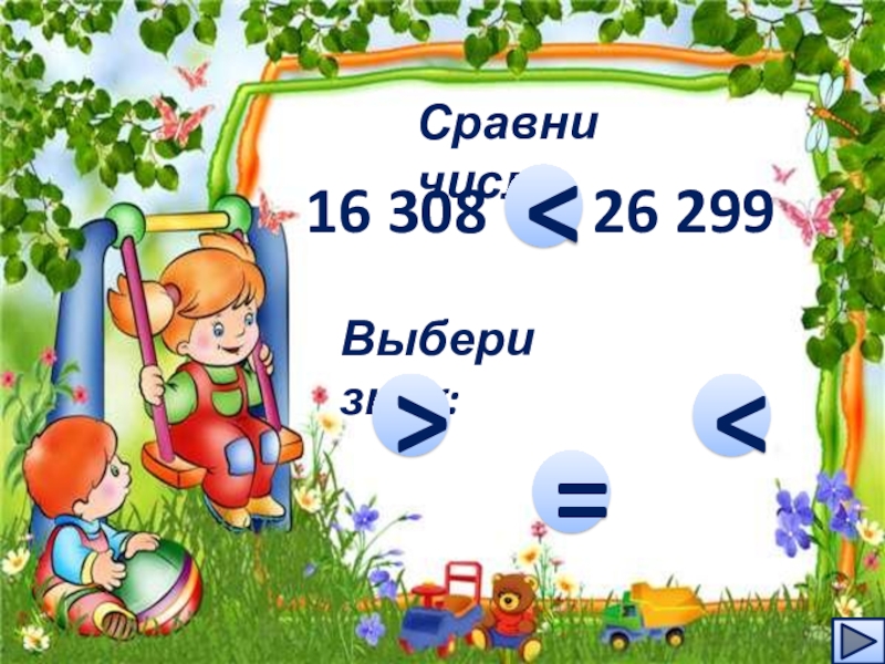 Сравни числа16 308    26 299…Выбери знак:=