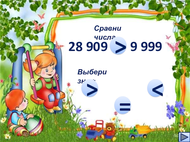 Сравни числа28 909    9 999…Выбери знак:>