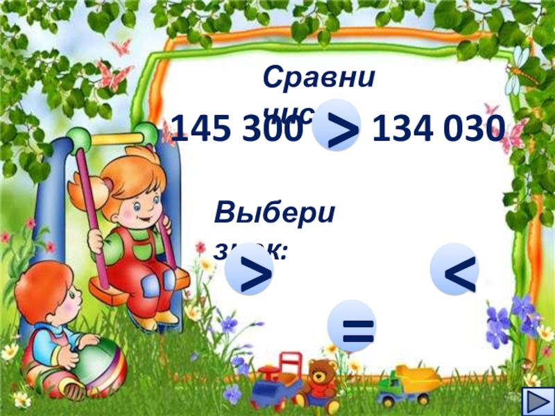 Сравни числа145 300    134 030…Выбери знак:>=
