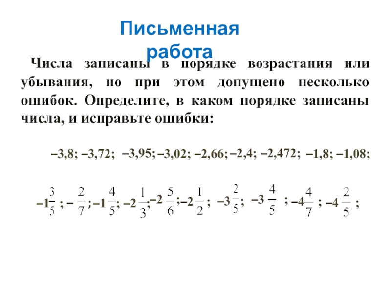 Числа записаны в порядке возрастания или убывания, но при этом допущено несколько ошибок. Определите, в каком порядке записаны числа, и исправьте ошибки: