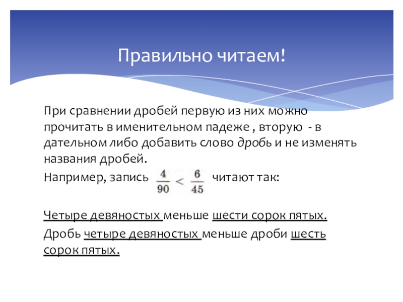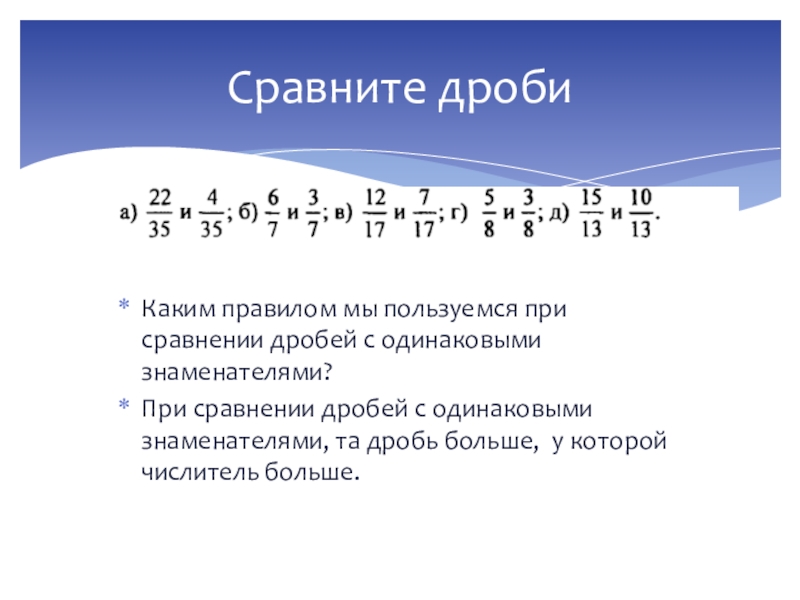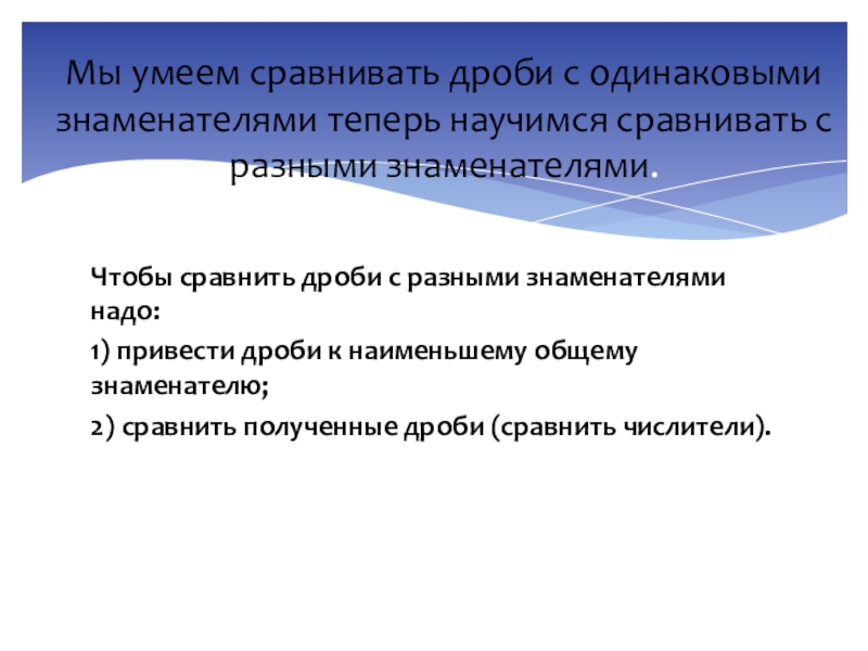 Мы умеем сравнивать дроби с одинаковыми знаменателями теперь научимся сравнивать с разными знаменателями.