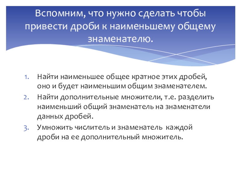 Вспомним, что нужно сделать чтобы привести дроби к наименьшему общему знаменателю.