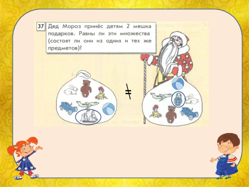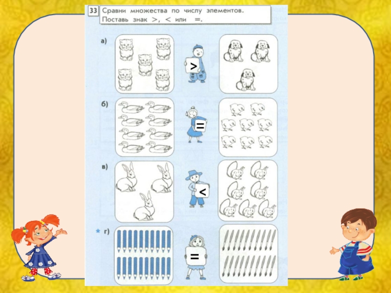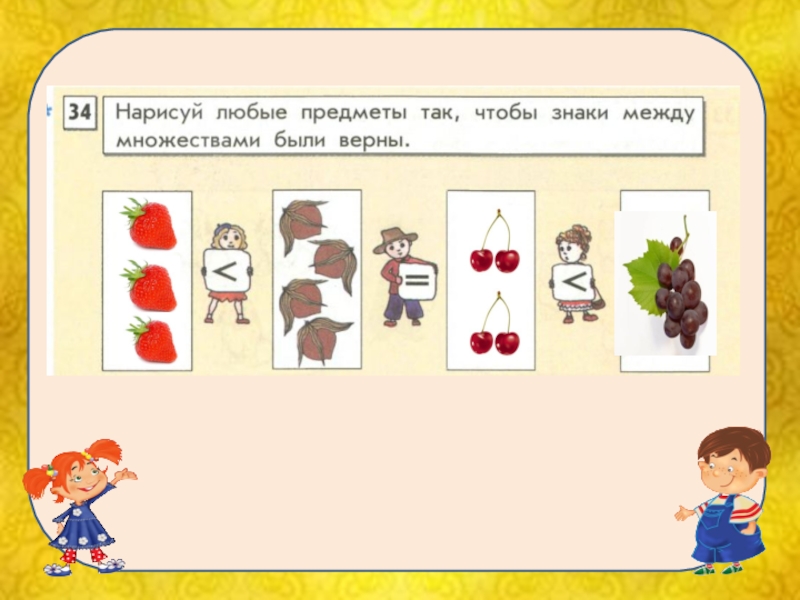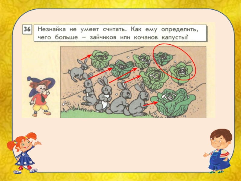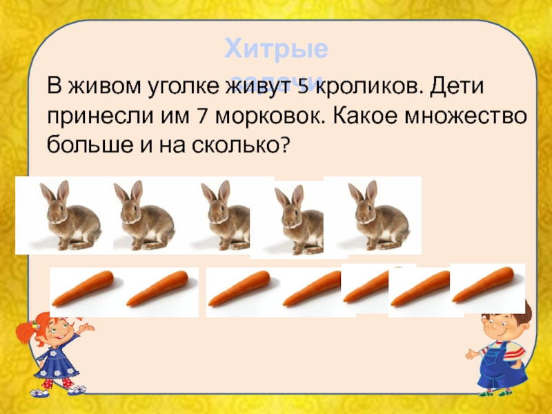 Хитрые задачиВ живом уголке живут 5 кроликов. Дети принесли им 7 морковок. Какое множество больше и на