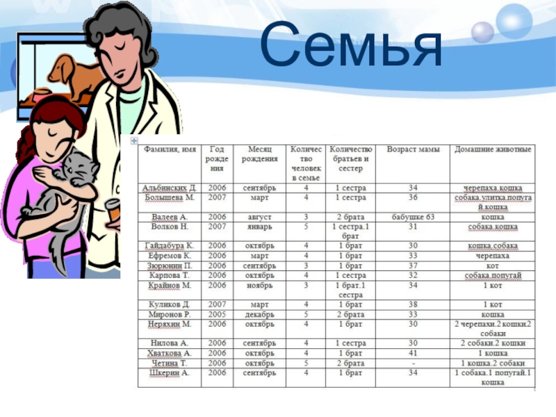 Выяснить, в каком году и месяце родились мои одноклассники и количество человек в семье; сколько братьев и сестер; возраст мамы; какие есть домашние животные.