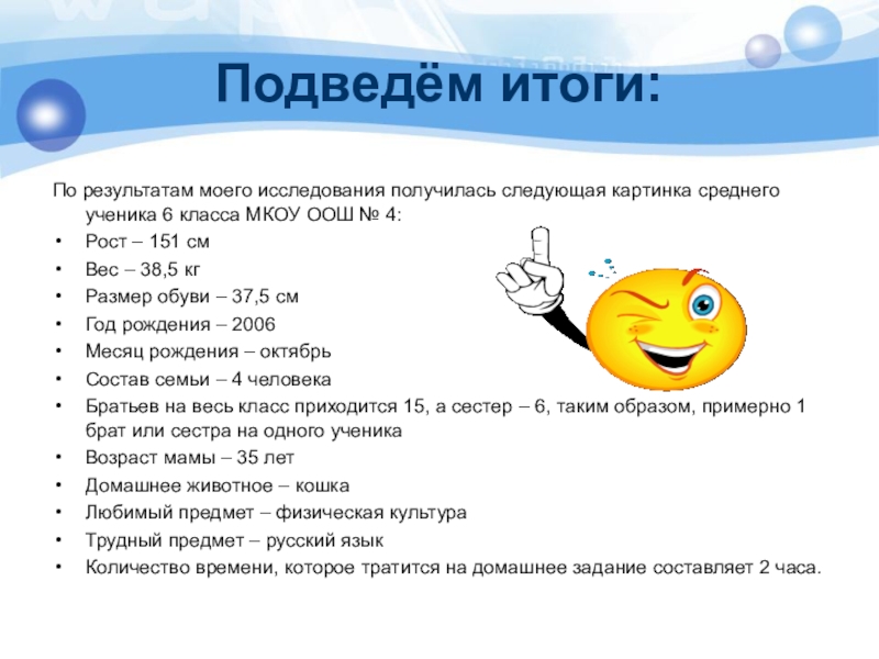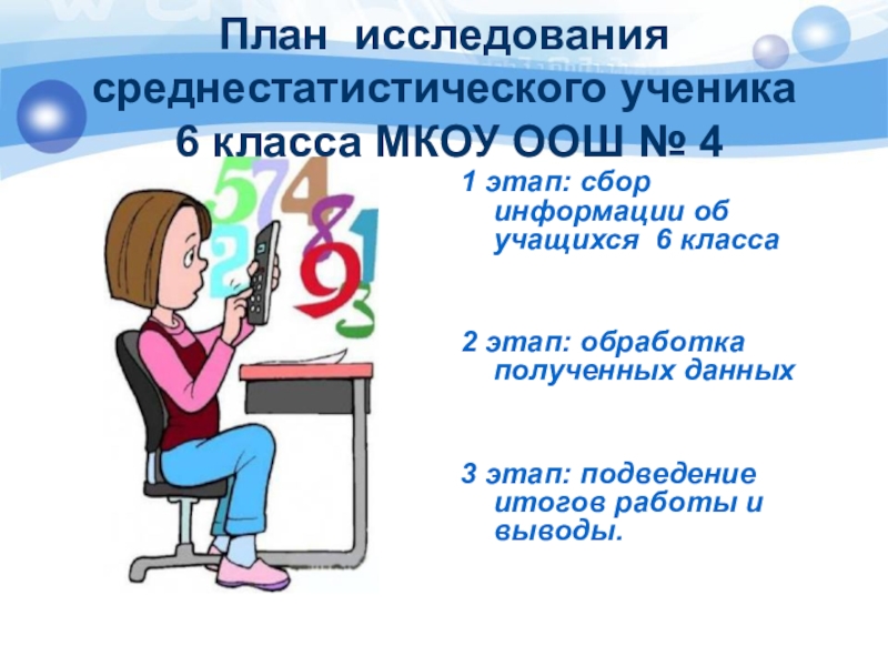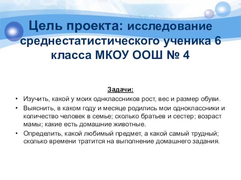 Слайд 2Цель проекта: исследование среднестатистического ученика 6 класса МКОУ ООШ № 4